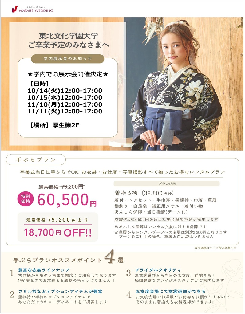※ 学位記授与式当日の着付け等は、ワタベウェディング 仙台フォトスタジオ(仙台市青葉区中央4-6-1 SS30 B1F)が会場となります。